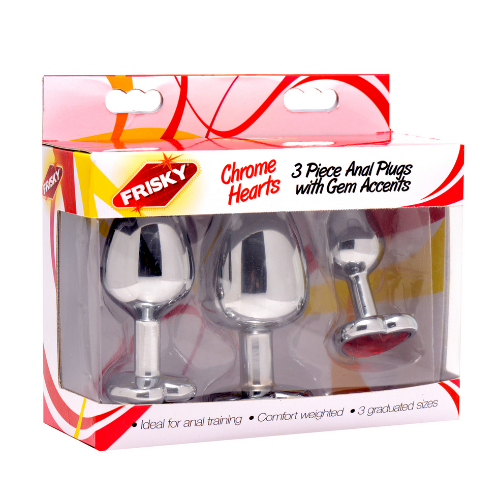 Ready for more anal pleasure? This set of three metal plugs is perfect for backdoor exploration! These beautiful butt plugs were designed to make anal play comfortable, exciting, and stimulating. Graduated in size, the plugs start out very small and increase at a comfortable interval. The tapered tip and smooth, seamless material create an easy insertion. The heart-shaped jewel at each base makes these buttplugs perfect for surprising your partner for a night in, but they are comfortable enough to wear long-term if you decide to go out first! Made of durable metal, these plugs are excellent for temperature play when you prepare them in hot or cold water. Compatible with both silicone and water-based lubricants. Clean with mild soap and warm water after use. Measurements: Small plug: 2.75 inches in total length, 2.5 inches insertable, 1 inch in diameter. Medium plug: 3.25 inches in total length, 3 inches insertable, 1.25 inches in diameter. Large plug: 3.75 inches in total length, 3.5 inches insertable, 1.75 inches in diameter. Material: Aluminum, plastic. Color: Red. Note: Includes 3 plugs.