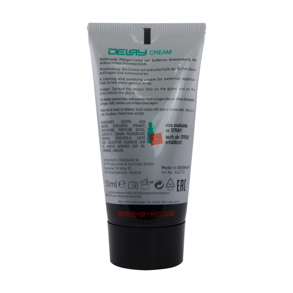 HOT DELAY CREAM Absolutely outstanding delay cream for HIM! Works proactively and effectively against premature ejaculation. The special and high concentration of cooling and oppressive natural extracts give him an entirely new feeling, while simultaneously strengthening.